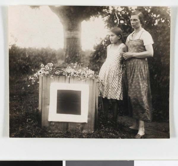 I’m glancing at some photographs. Here’s an image of a sick and bedridden Kazimir Malevich. Here are some photographs of his body in an architecton[1]-shaped coffin, surrounded by his works. Images from a funeral procession in May 1935. A photograph of his family under an oak tree beside a cubic gravestone marked with the infamous black square, again dated 1935, place: Nemchinovka.