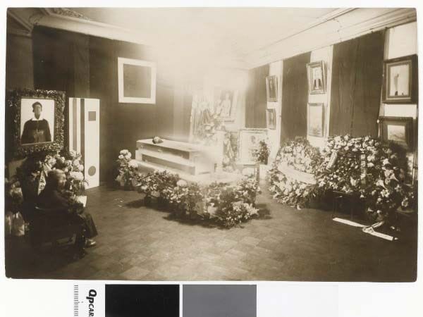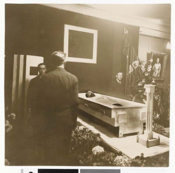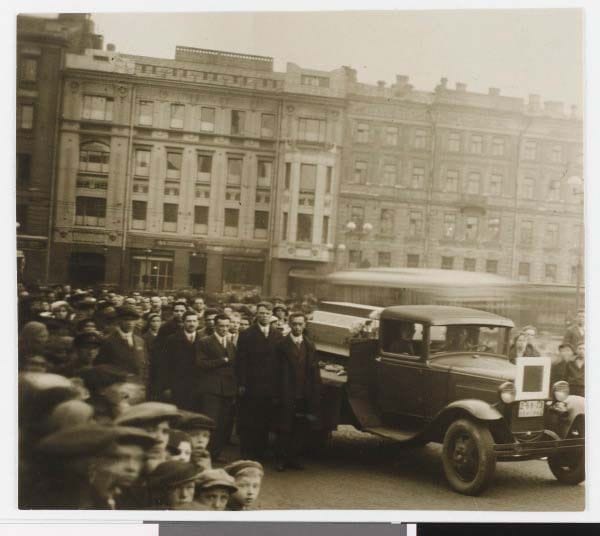 The civil memorial service was held in the artist’s apartment. The death mask was taken and the body embalmed, then moved to a large living room where paintings were hung on the walls by friends and family. The coffin was placed with its head toward the “Black Square,” next to the coffin – an unfinished painting, a palette with brushes and paint, a photograph of the deceased was pinned to the frame. On May 18, Malevich’s body was removed from the room for its journey to Moscow. The reinforced coffin was placed on a truck covered with red cloth, the sides of the vehicle open to allow onlookers see the closed coffin. Suetin had painted the truck in suprematist style, in the colors of red, black and green. Attached to the front bumper was “The Black Square”. The coffin was unloaded at the train station and placed in a freight car for transport to Moscow. A black square was painted on the side of the freight car.